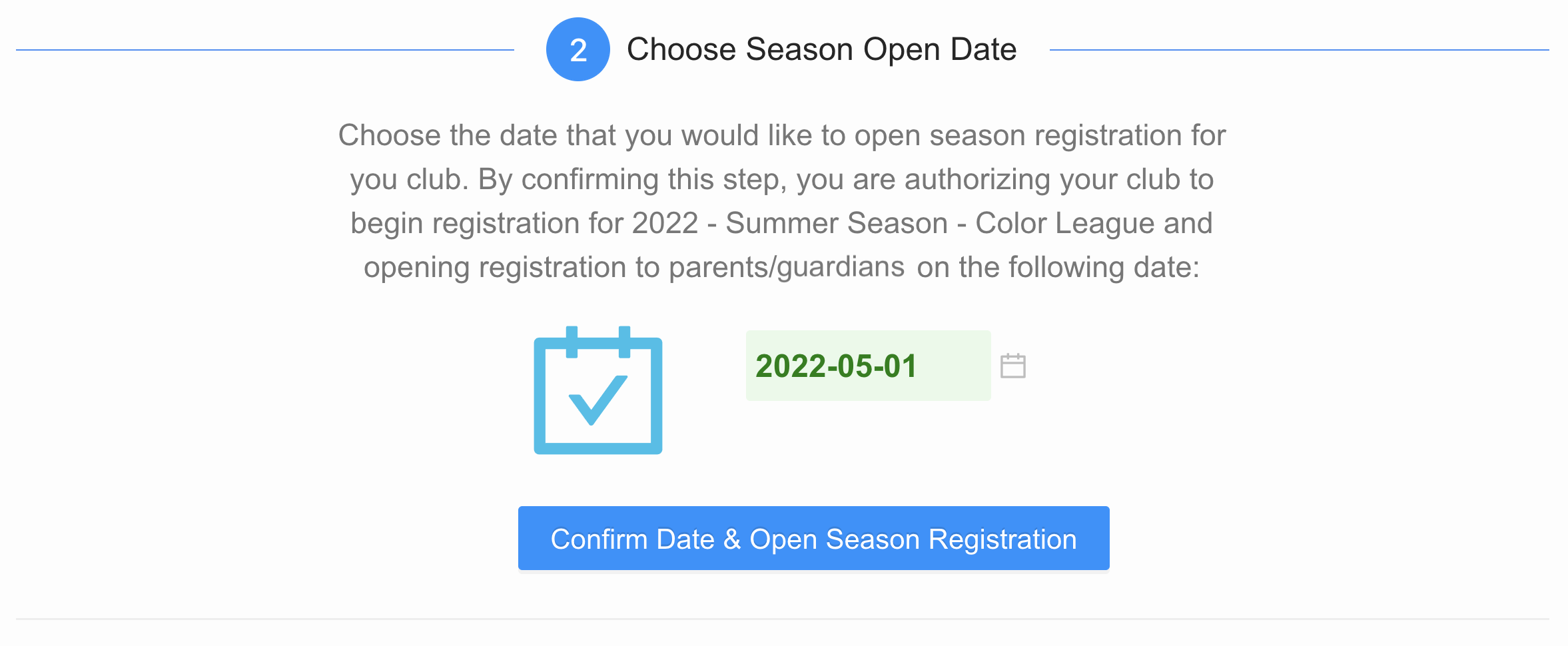 After confirming your season setup, open your registration by selecting the desired date to open the season to your parents and confirm.