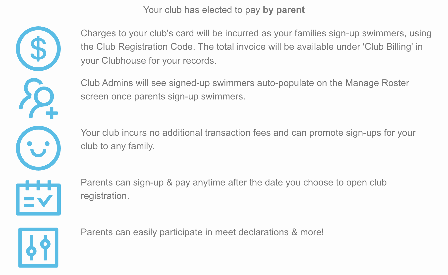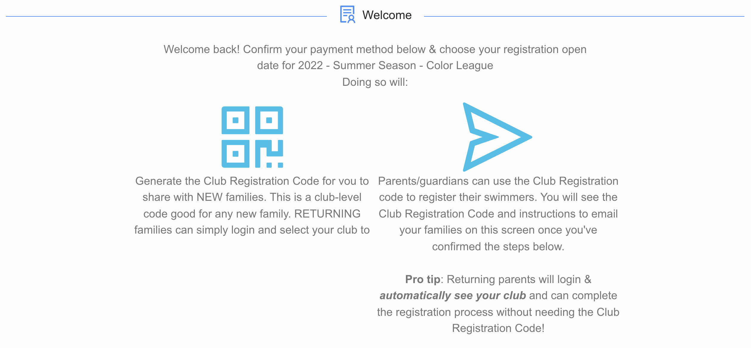 After you Confirm Date & Open Season Registration, your Club Registration Code will be activated in your Registration header on the date you've selected. You can find out how to distribute your Club Registration Code so your swim families can sign-up.